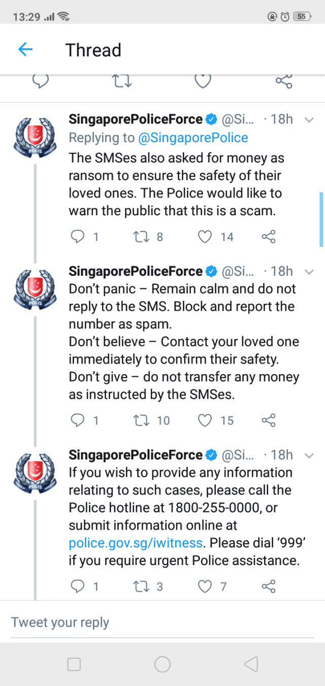 The Police have received numerous reports from members of the public informing that they have received SMSes (Short Message Service) claiming that their loved ones had been kidnapped. pic.twitter.com/gthAH0D4ii