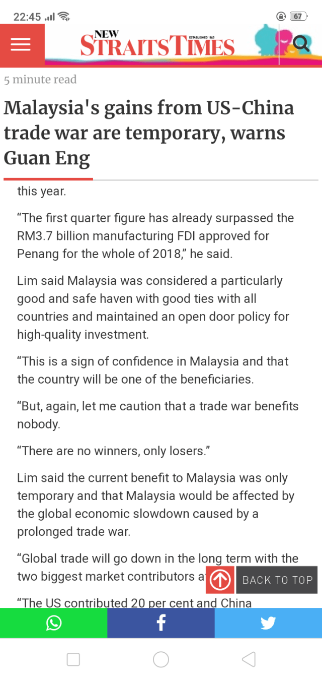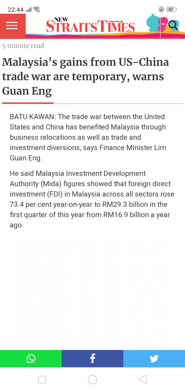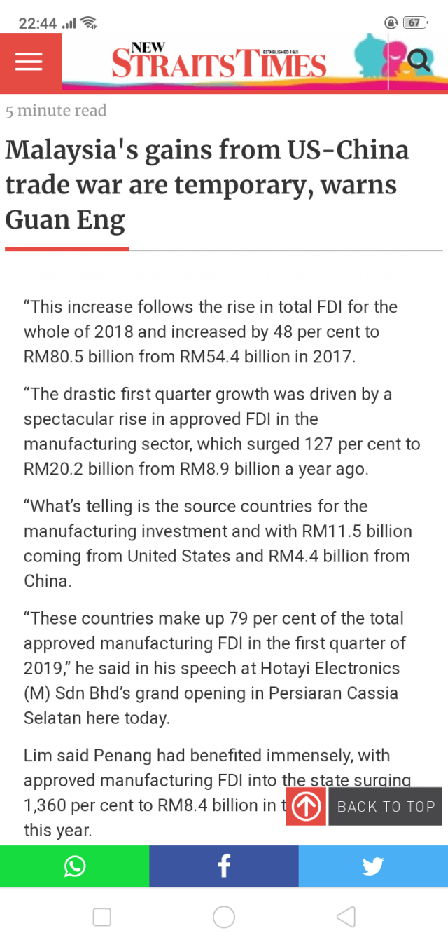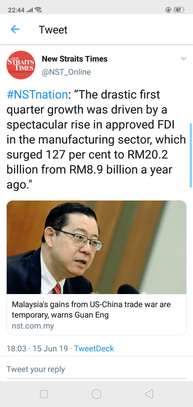 https://www.nst.com.my/news/nation/2019/06/496553/malaysias-gains-us-china-trade-war-are-temporary-warns-guan-eng…10 June 2019..https://twitter.com/malaymail/status/1137916811901620225KUALA LUMPUR, June 10 — Foreign investments increased 73.4 per cent to RM29.3 billion in the first quarter of the year from RM16.9 billion in the first quarter of 2018, the Malaysian Investment Development Authority (Mida) said today.Mida said domestic investments totalled RM24.6 billion, comprising 45.6 per cent of total investments of RM53.9 billion in the manufacturing, services, and primary sectors in Q1 this year. Total investments grew 3.1 per cent from the same period last year.“The positive investment growth of Q1 2019 was mainly driven by the robust performance of the manufacturing sector that soared by 126.8 per cent compared to Q1 2018,” MIDA said in a statement.The agency under the Ministry of International Trade and Industry (Miti) added that the investments for the first quarter of the year were expected to generate more than 41,200 job opportunities, including 22,970 and 18,000 job opportunities in the manufacturing and services sectors respectively.The services sector attracted the largest share of investments in the first quarter of the year at RM26.1 billion, 69 per cent of which came from domestic sources.The five main sub-sectors that led the services sector with the highest total investment were real estate (RM11 billion or 42.3 per cent), distributive trade (RM8.2 billion or 31.6 per cent), utility (RM4 billion or 15.4 per cent), hotel and tourism (RM1.8 billion or 7.0 per cent) and support services (RM550.9 million or 2.1 per cent).According to Mida, the manufacturing sector recorded an “impressive” investment of RM25.4 billion in Q1 this year, up 126.8 per cent from the RM11.2 billion recorded in Q1 2018.“The manufacturing projects approved will create 22,970 new job opportunities. The jobs created include 1,590 electrical and electronics engineers, 710 mechanical engineers and 180 chemical engineers. In addition, the approved manufacturing projects will also require about 1,710 skilled craftsmen such as plant maintenance supervisors, tools and die, makers, machinists, IT personnel, quality controllers, electricians and welders.”Mida also noted that foreign investments in manufacturing projects increased by 127 per cent to RM20.2 billion in the first quarter of the year from RM8.9 billion in the same period last year.Mida highlighted two US projects from Micron Technology and Jabil Circuit that will be expanding their manufacturing operations in Penang, as well as Chinese investment from XSD International Paper that is expected to drive papermaking in the region with its proposed RM2.3 billion investment.A total of 150, or 70 per cent, of the manufacturing projects approved will be located in Selangor(75), Penang (41) and Johor (34). Penang will benefit the most from these investments at RM8.8 billion, followed by Kedah (RM7.6 billion) and Johor (RM2.4 billion).The primary sector contributed RM2.4 billion or 4.5 per cent of total investments in Q1 2019, 58.3 per cent of which came from domestic sources. Most of the investments were contributed from mining, dominated by oil and gas exploration activities.