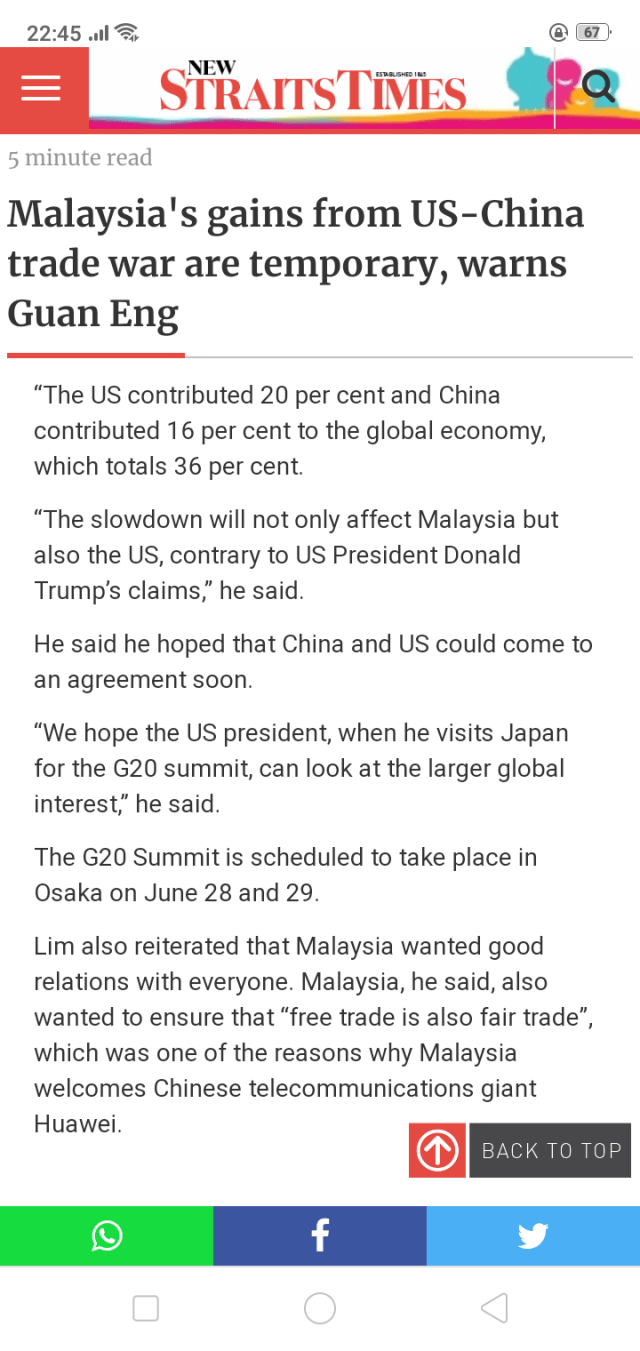 https://twitter.com/fmtoday/status/1129667537992527872PETALING JAYA: Malaysians can celebrate Wesak Day with good news on three economic fronts, said Finance Minister Lim Guan Eng.He said the economy grew by 4.5% in the first quarter of this year, which is above market expectations of 4.3% as compiled by Bloomberg.Coupled with this is the achievement of RM21.7 billion in realised foreign direct investments (FDI) in the first quarter — the highest level recorded in history for one quarter — and the highest number of tourist arrivals in two years.Lim said the 4.5% Q1 expansion in the economy showed its resilience in the face of uncertain external challenges caused by the trade war between the United States and China.He said realised FDI — actual foreign investments during the period — increased by 94.8% in the same quarter from a year ago.“This indicates the strength of the economy and the rising confidence foreign investors have in Malaysia and its government,” he said in a statement today.“The RM21.7 billion realised FDI in the first quarter of 2019 is the highest level ever recorded in Malaysian history for one quarter.“These new investments will raise the economy’s growth potential and create additional jobs for Malaysians in the near future.”He said the record high FDI mainly came from Japan, which contributed RM8.4 billion, followed by Austria (RM3.7 billion) and Hong Kong (RM2.8 billion).The government hoped the domestic private sector will emulate the same confidence exhibited by the foreign investors, he said.Current account surplus in the quarter rose to RM16.4 billion, or 4.7% of gross national income (GNI), from 3.0% in the previous period, and will remain in surplus in the foreseeable future.Lim also said 6,696,000 tourists visited Malaysia in Q1, the largest since the fourth quarter of 2016.This was a 2.7% increase from a year ago when 6,520,000 tourists visited Malaysia, and a 3.9% increase when compared to the 2018 fourth quarter (6,446,000).https://www.freemalaysiatoday.com/category/nation/2019/05/18/good-news-on-3-fronts-as-malaysia-celebrates-wesak-says-guan-eng/…The Ringgit in June 2019https://twitter.com/bernamadotcom/status/1137892246194278400
