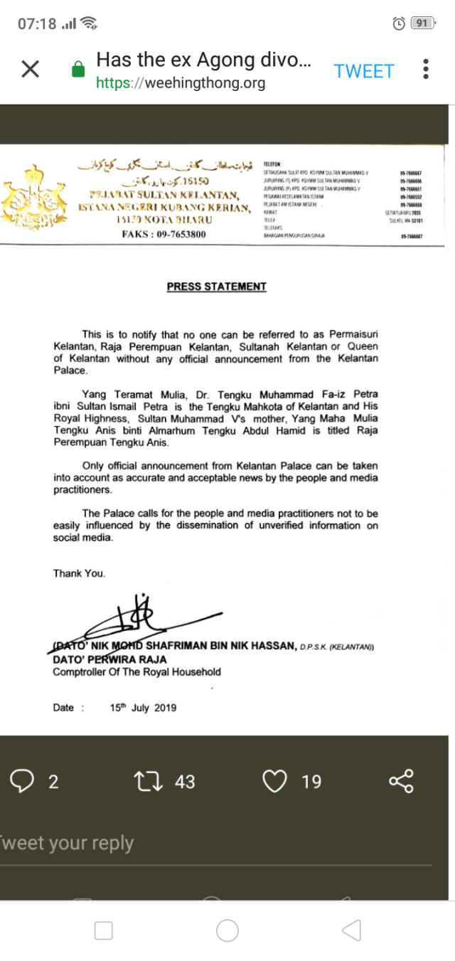 “Please be informed that HRH (His Royal Highness) has irrevocably divorced Ms Rihana Oksana Gorbatenko in June 22, 2019, by three Talaqs in accordance with Syariah laws and the Kelantan Syariah Court has issued a Divorce Certificate dated July 1, 2019, in accordance with the Islamic Family Law Enactment 2002.