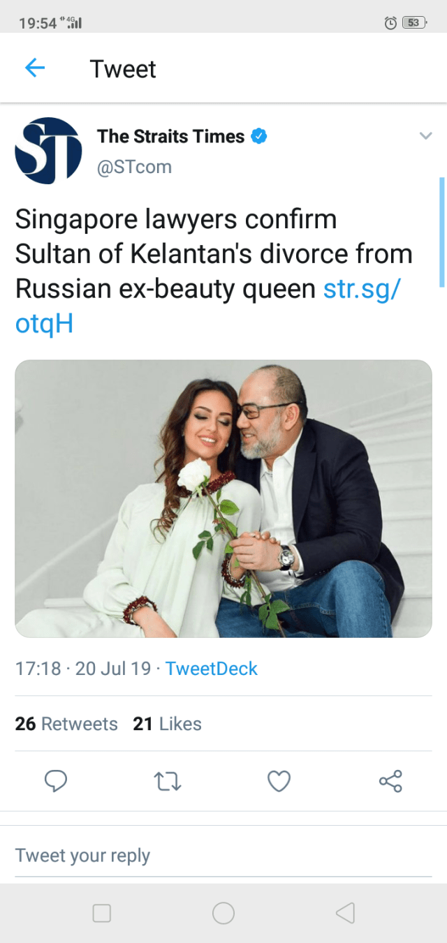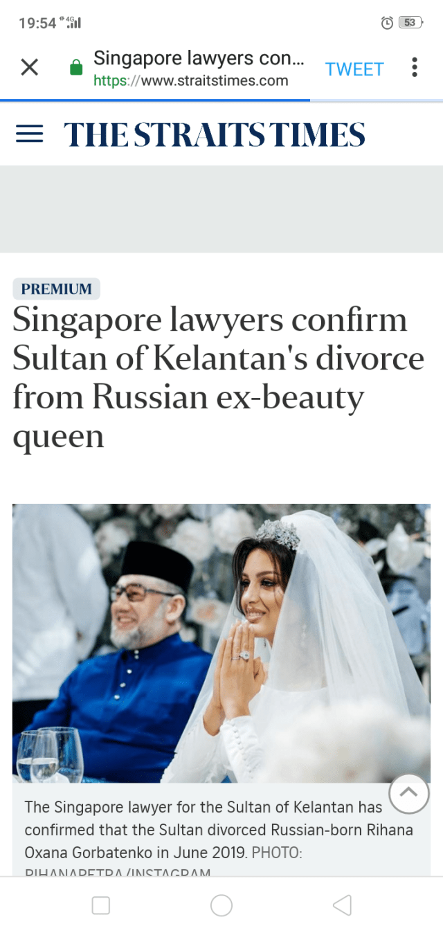 KUALA LUMPUR: News on Sultan of Kelantan Sultan Muhammad V, 50, divorcing his wife, former Russian beauty pageant contestant Rihana Oksana, 26, after just a year of marriage has been confirmed.