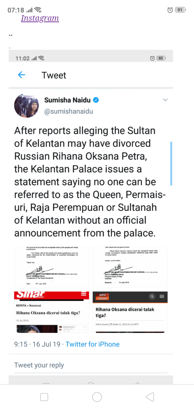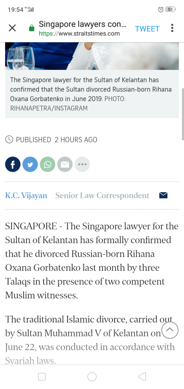 “Please be informed that HRH (His Royal Highness) has irrevocably divorced Ms Rihana Oksana Gorbatenko in June 22, 2019, by three Talaqs in accordance with Syariah laws and the Kelantan Syariah Court has issued a Divorce Certificate dated July 1, 2019, in accordance with the Islamic Family Law Enactment 2002.