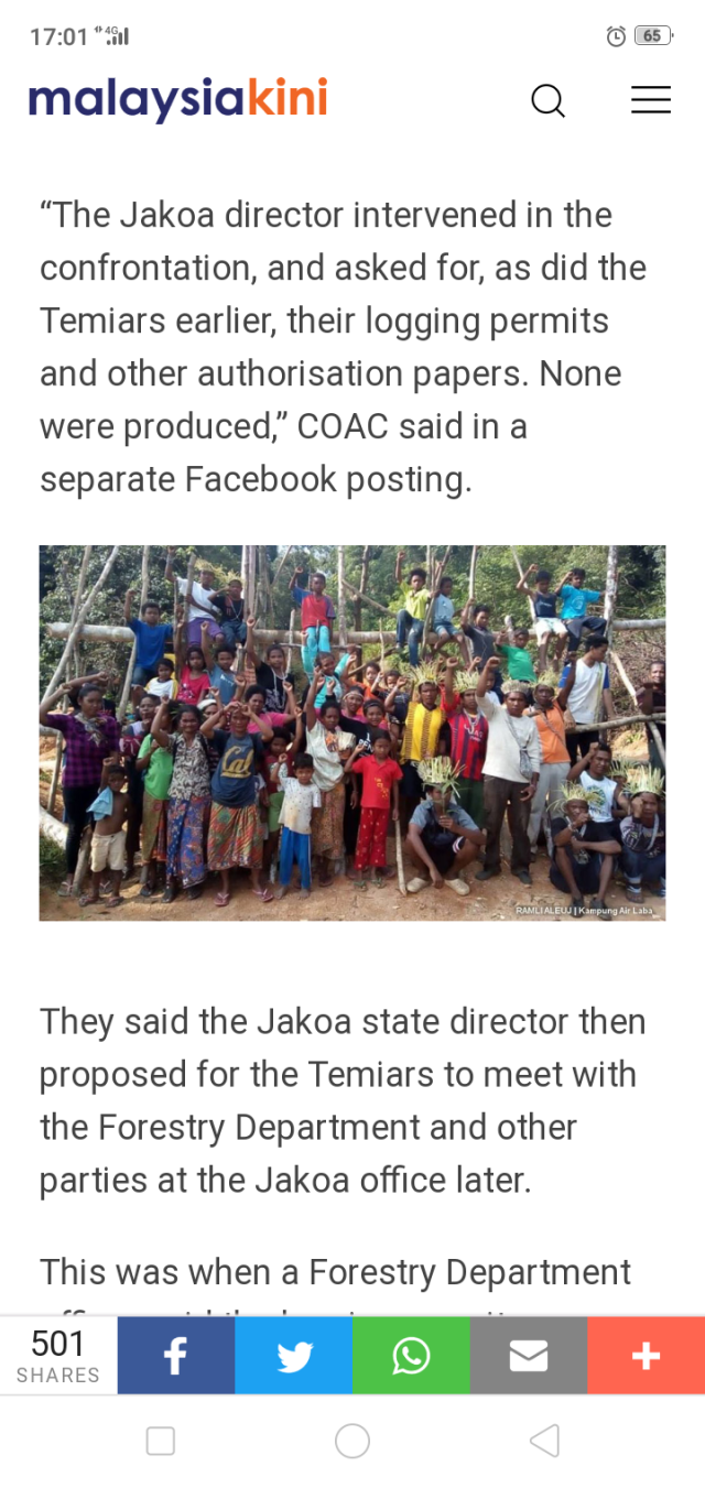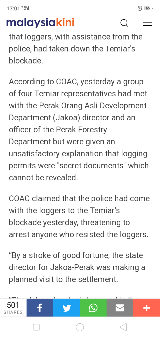 “The Temiars plan to rebuild the blockade tonight. Forestry rules seem to be ignored here. We even suspect the logging is illegal because they refuse to put up signboards or show permits,” Nicholas told Malaysiakini.