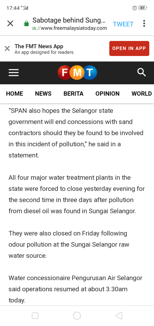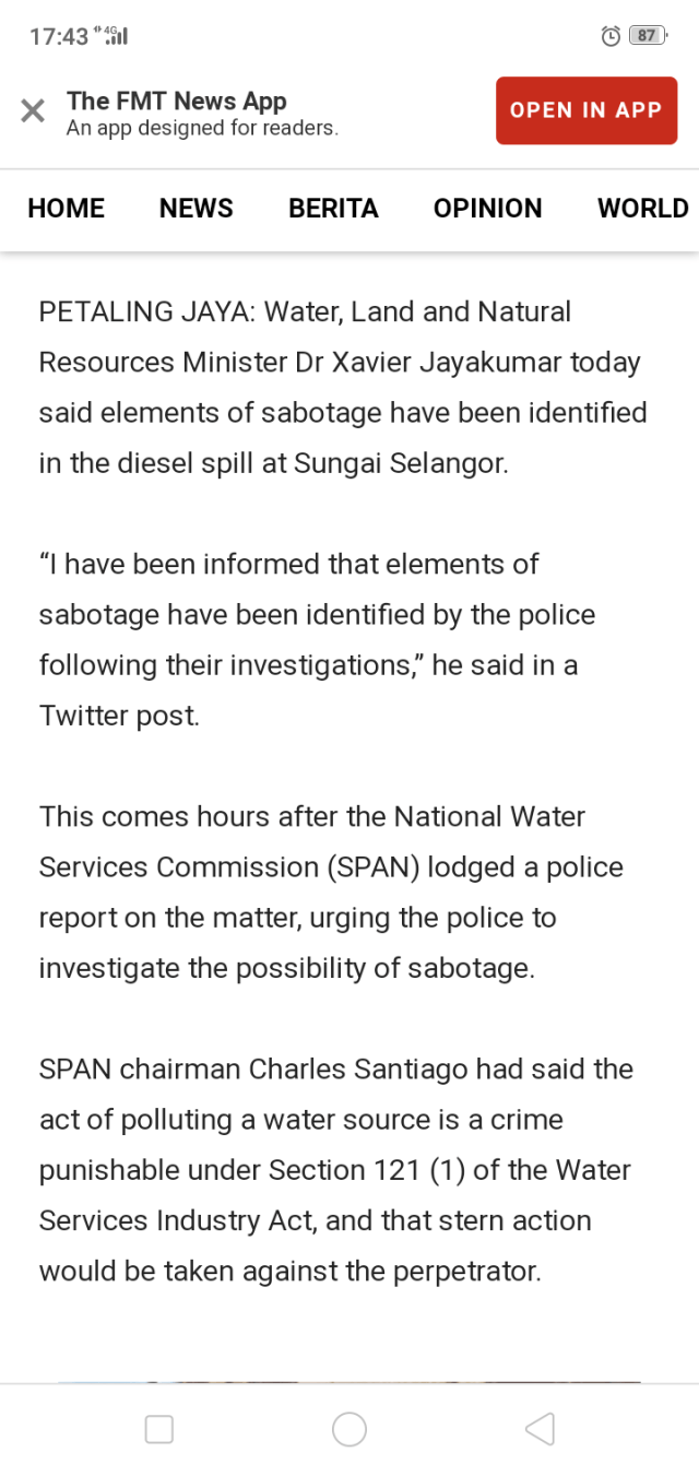 Saya telah meninjau sendiri tapak lokasi pencemaran Sungai Selangor. Tumpahan diesel menyebabkan bekalan air tercemar dan gangguan berlaku. Terdapat unsur-unsur sabotaj dan laporan polis telah dilakukan. Tindakan undang-undang akan diambil kepada mereka yang bertanggungjawab