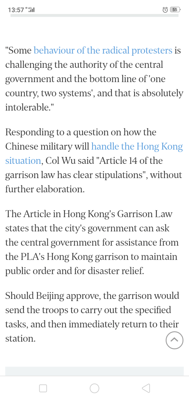 Concerns only deepened on Wednesday when defence ministry spokesman Wu Qian commented on the recent clashes and protests in Hong Kong. Without suggesting any action or plans by the PLA, Mr Wu made clear that the Garrison Law, which governs the operations of PLA troops in Hong Kong, already stipulates that the PLA is legally allowed to help the city maintain law and order at the request of Hong Kong’s government.