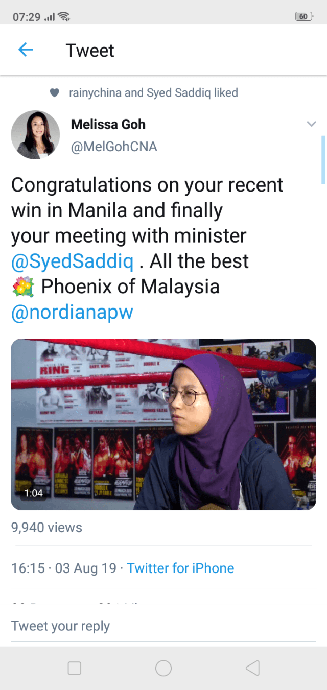 Congratulations on your recent win in Manila and finally your meeting with minister @SyedSaddiq . All the best 💐 Phoenix of Malaysia @nordianapw pic.twitter.com/AJ68xDT4kV
