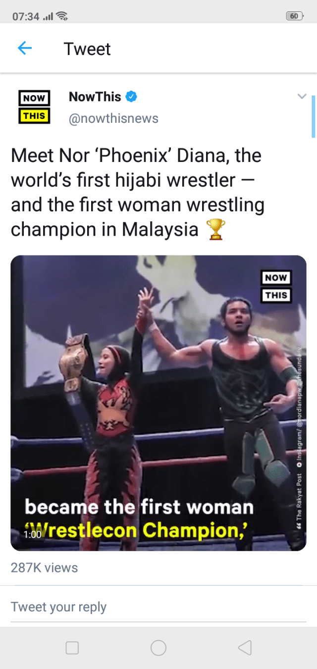 Meet Nor ‘Phoenix’ Diana, the world’s first hijabi wrestler — and the first woman wrestling champion in Malaysia 🏆 pic.twitter.com/HxMi0qUZMH