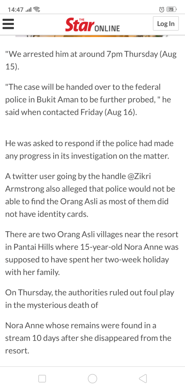 SEREMBAN: Police have arrested a 29-year-old man for alleging that Irish teenager Nora Anne Quoirin, 15, who was found dead after going missing from a holiday resort near here, was raped by an Orang Asli.