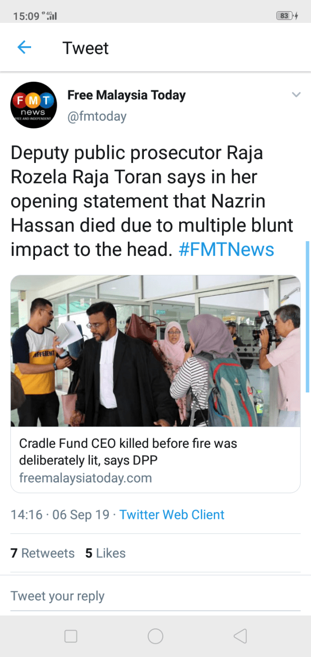 Shafee is representing Nazrin’s wife, Samirah Muzaffar, who along with her two teenage sons and Indonesian national Eka Wahyu Lestari, is charged with the murder.
