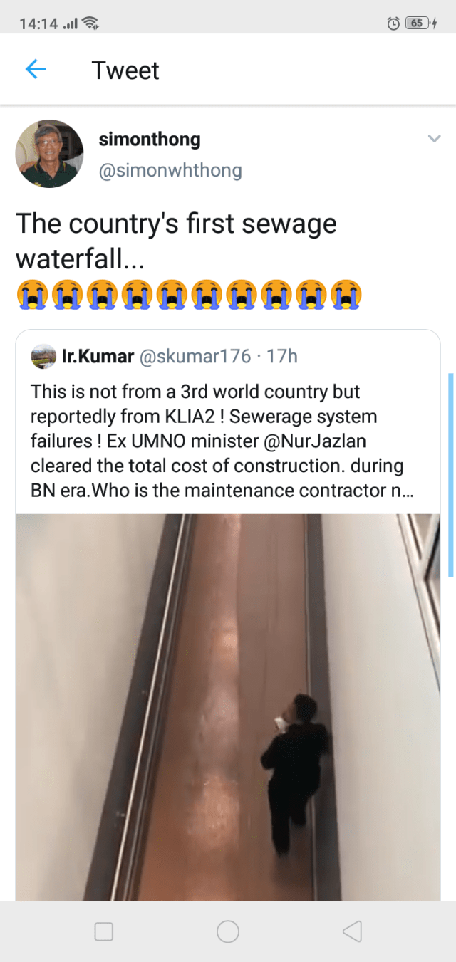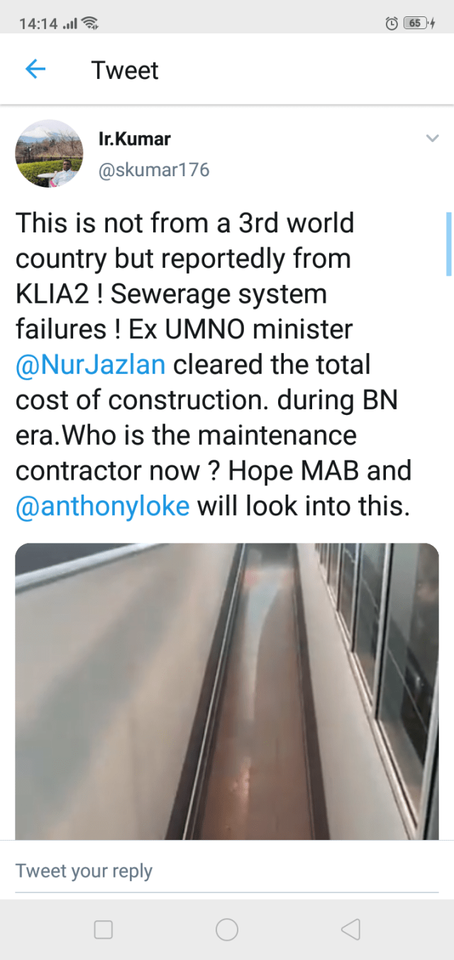 This is not from a 3rd world country but reportedly from KLIA2 ! Sewerage system failures ! Ex UMNO minister @NurJazlan cleared the total cost of construction. during BN era.Who is the maintenance contractor now ? Hope MAB and @anthonyloke will look into this. pic.twitter.com/VqsDsv5PJ4