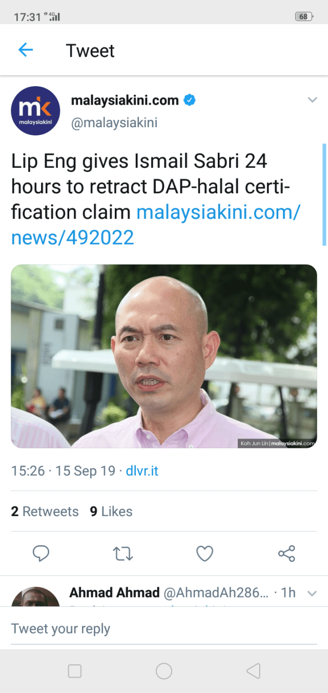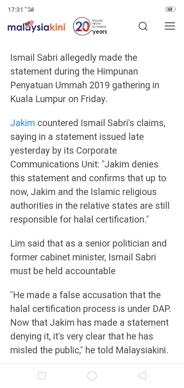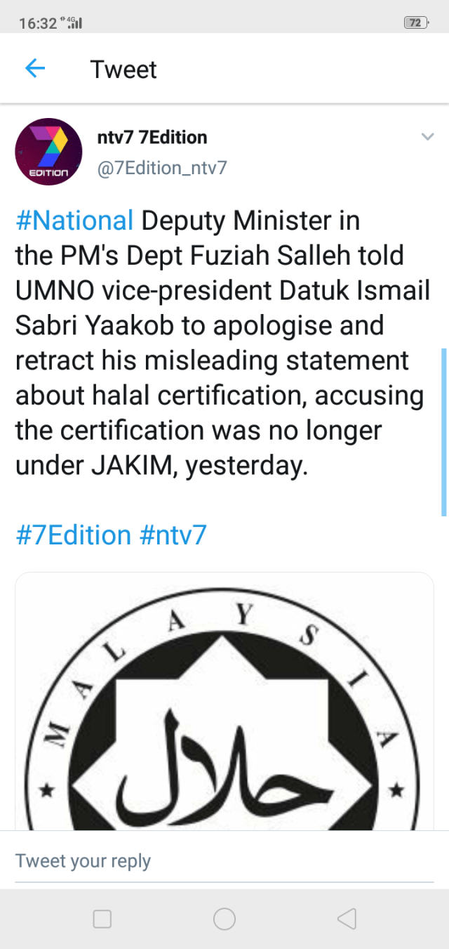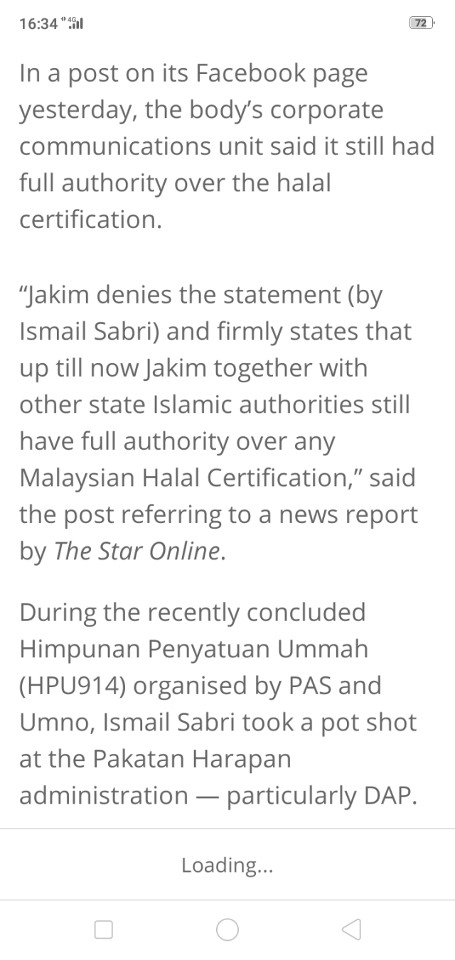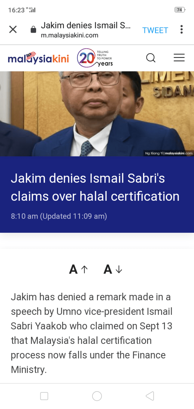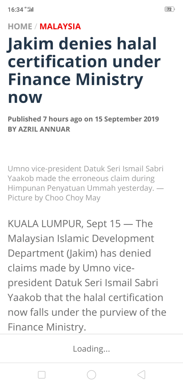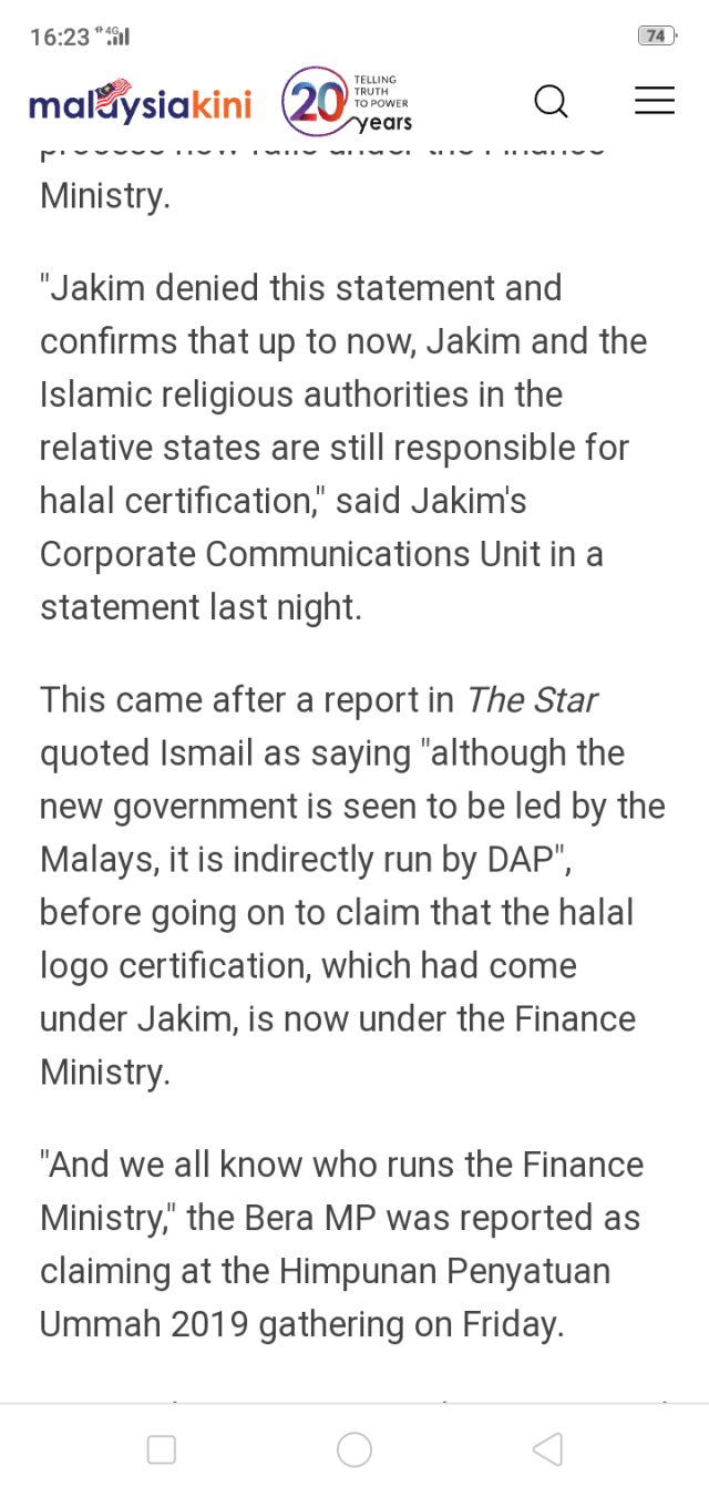The report also cited Ismail as saying the halal logo certification “is now” (kini) under the Finance Ministry, instead of the Islamic Development Department (Jakim).