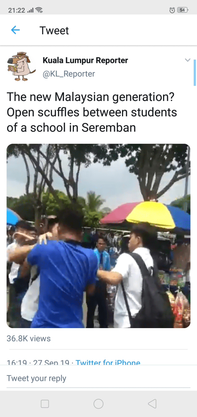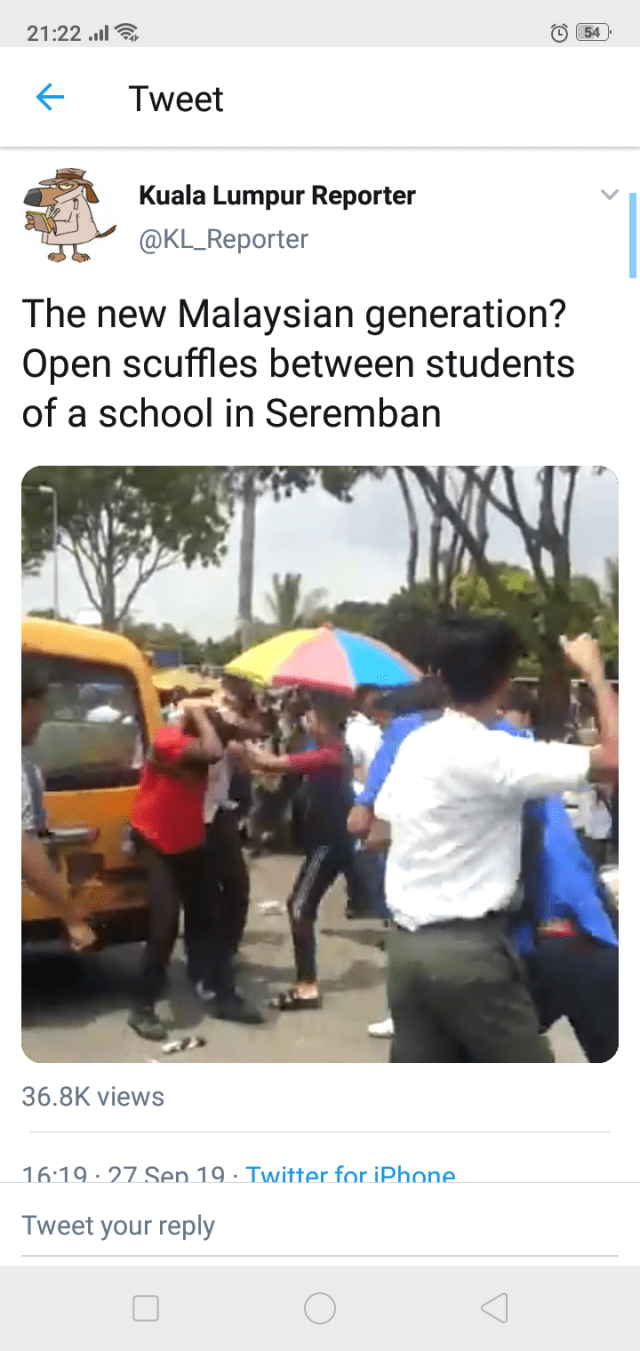 The new Malaysian generation? Open scuffles between students of a school in Seremban pic.twitter.com/GEYynAUq9b