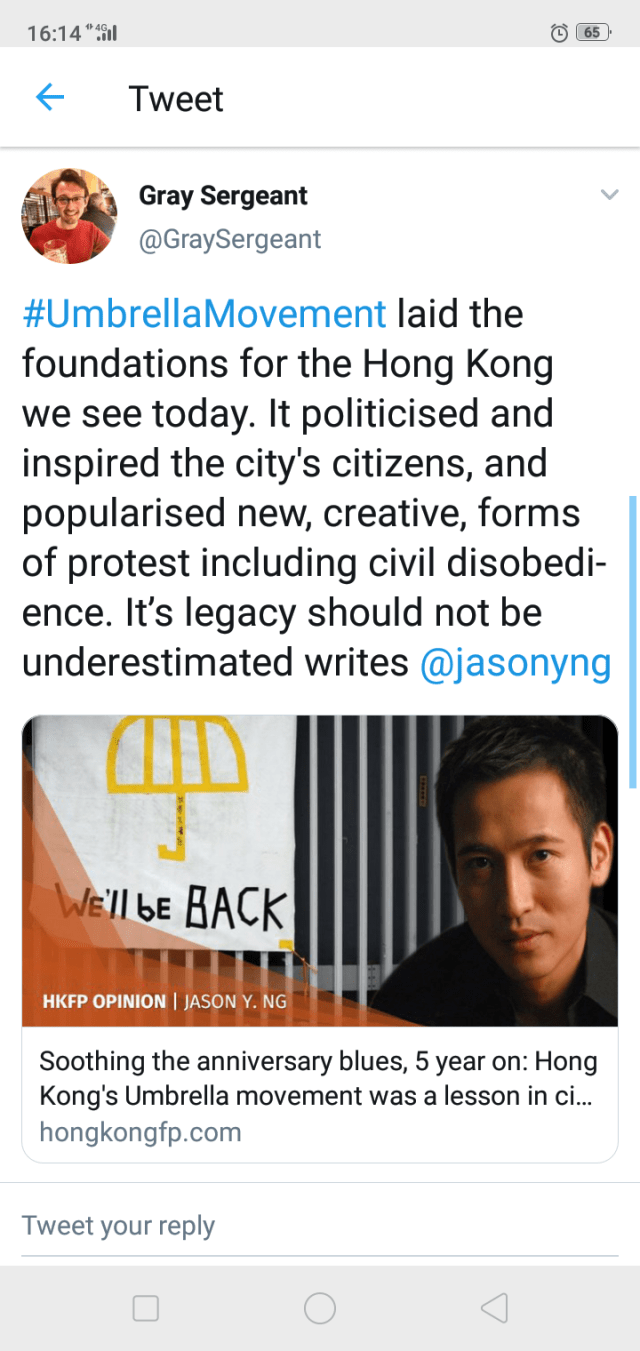 #UmbrellaMovement laid the foundations for the Hong Kong we see today. It politicised and inspired the city's citizens, and popularised new, creative, forms of protest including civil disobedience. It’s legacy should not be underestimated writes @jasonyng https://t.co/wUipegofm5
