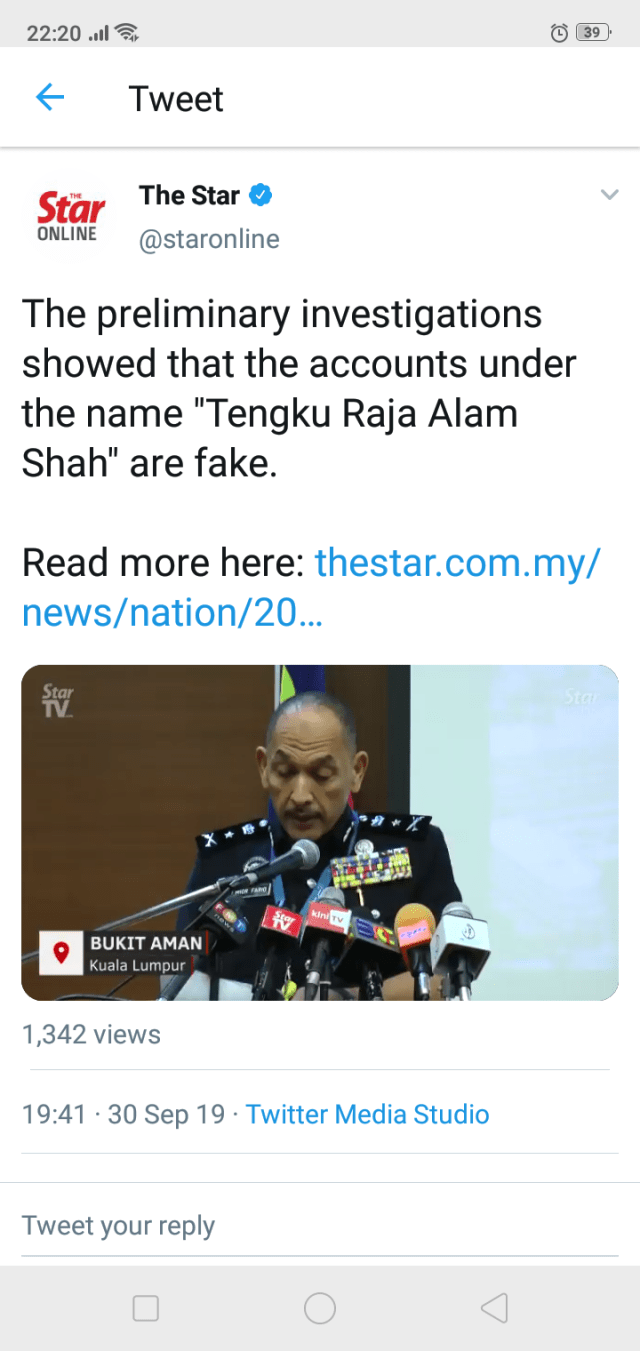 The preliminary investigations showed that the accounts under the name "Tengku Raja Alam Shah" are fake.