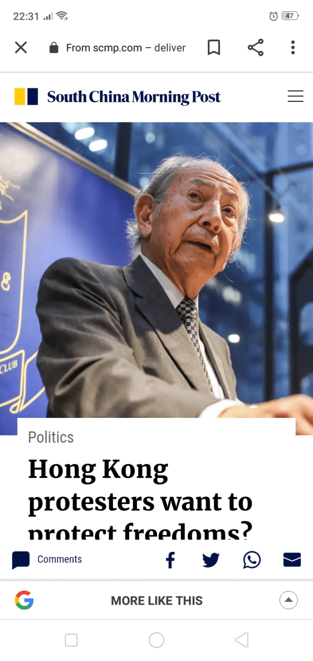 為未來設計治理模式,是超出了香港特別行政區政府的權力範圍。要迫使香港政府促進更大的民主是徒勞的。不管是你喜歡也好。不喜歡也好。權力就是在北京。沒有別的地方了。香港現在享有中國其他地方沒有的自由。認為非法集會示威和街頭暴力會軟化北京的對香港的態度是荒謬的。常識表明,它只會產生相反的效果。