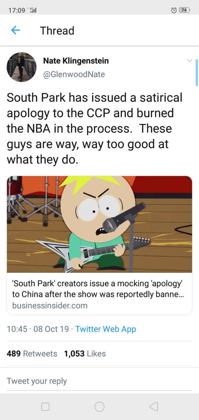 Part of South Park S23 E02 😂 pic.twitter.com/ViR5YluF4e — Stuart (@xutsiang) October 9, 2019