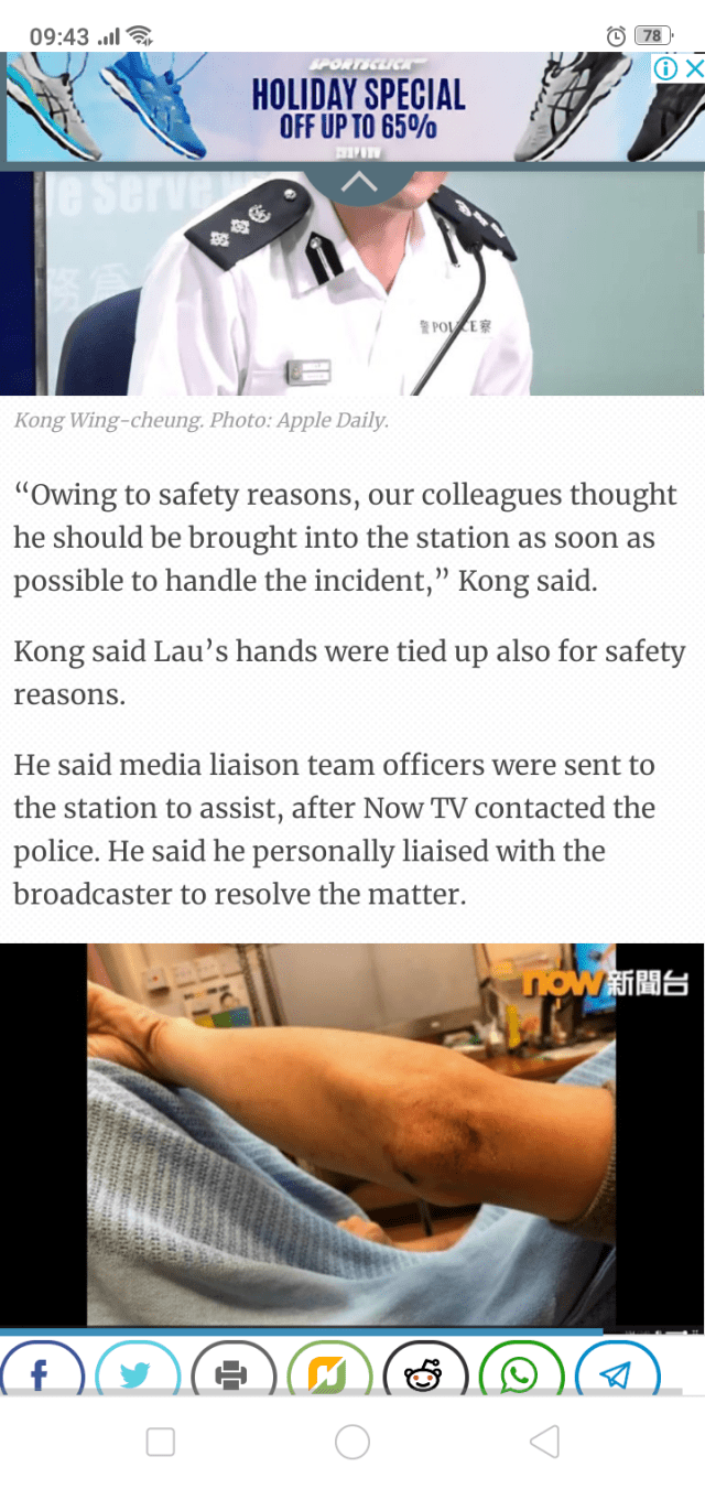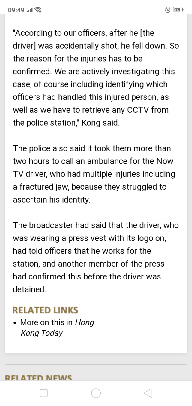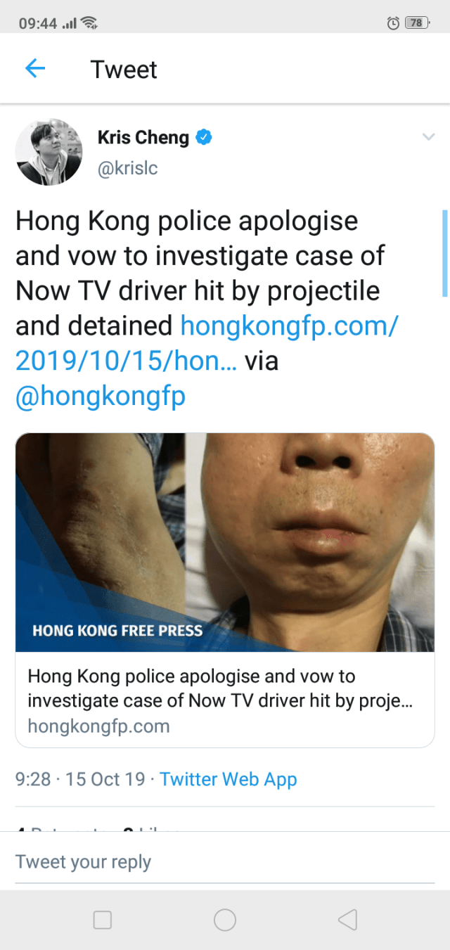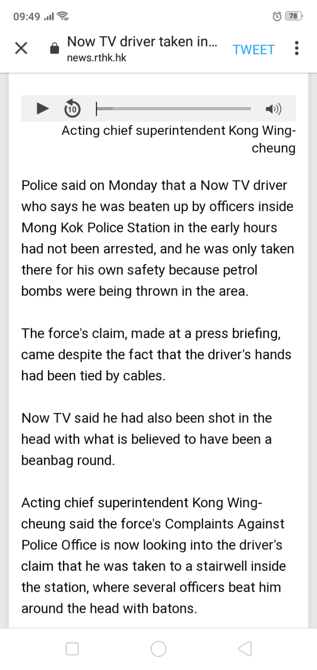 I have to put the 2nd part in comment section due to the limitation on video length. The Now TV driver accuses the police officer of pushing his face against a wall and beating him with batons inside the police station.#FreedomOfThePress #HongKongProtests #PoliceState pic.twitter.com/Fh2v5ZgCIG