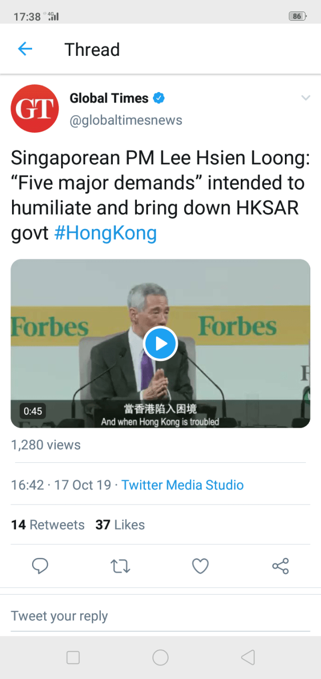 Singaporean PM Lee Hsien Loong: “Five major demands” intended to humiliate and bring down HKSAR govt #HongKong pic.twitter.com/a2vai1OlPB