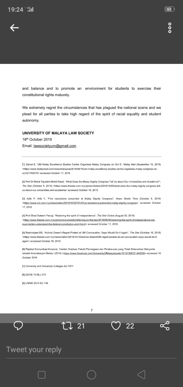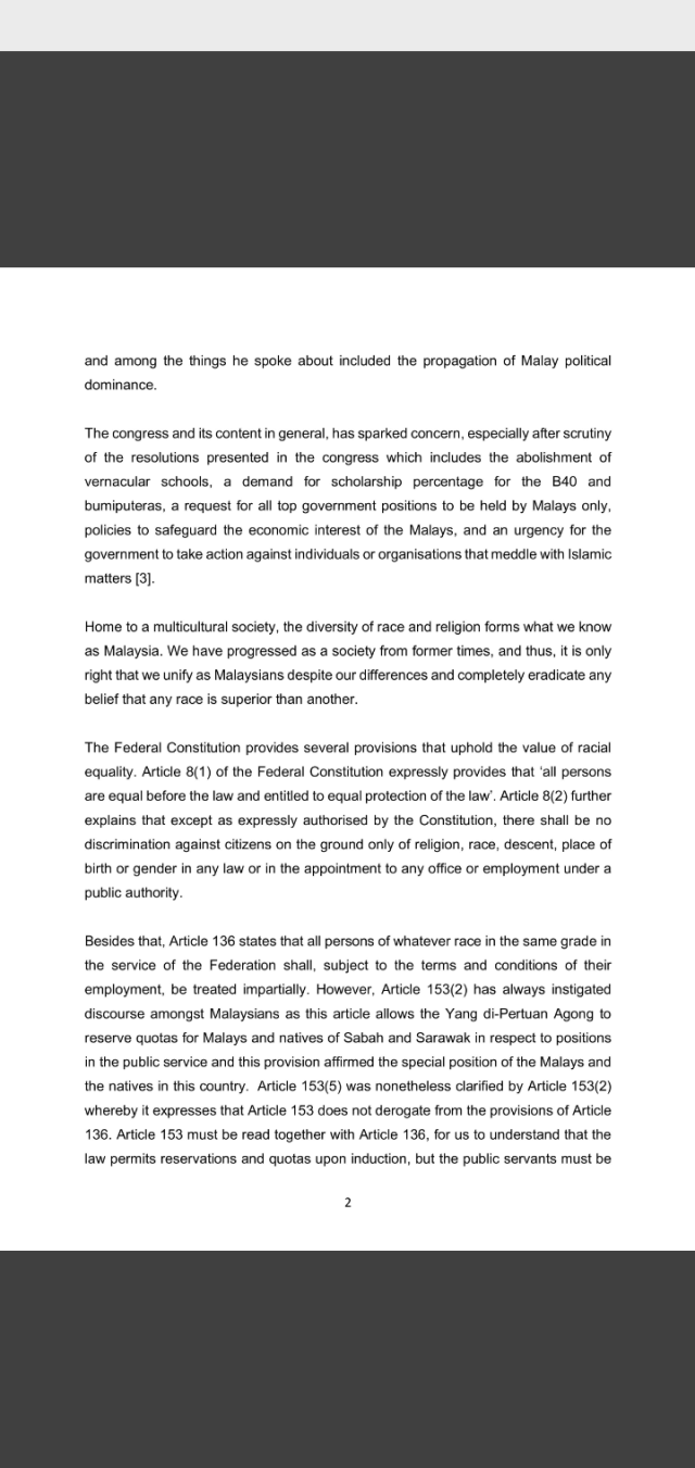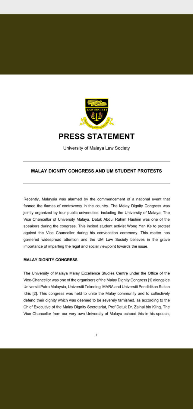University of Malaya Law Society Press Statement: Malay Dignity Congress and Student Protest…