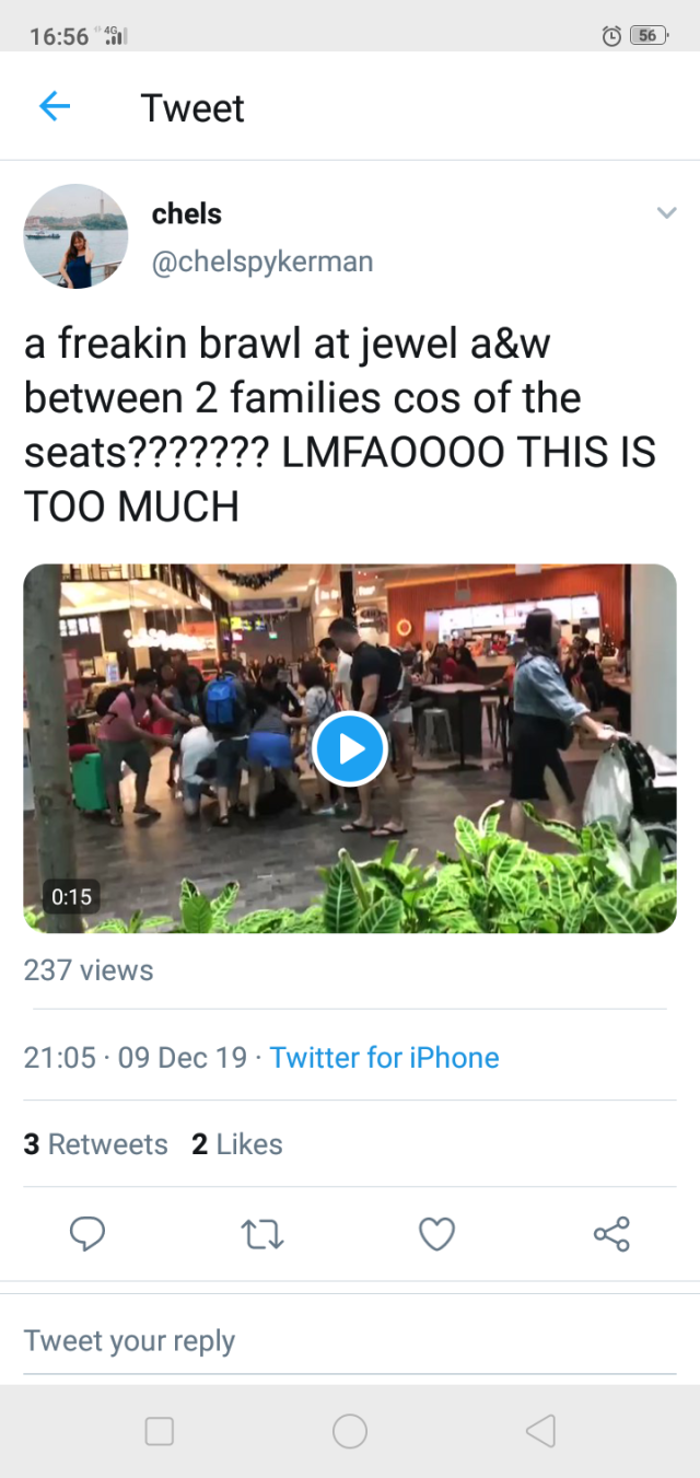 a freakin brawl at jewel a&w between 2 families cos of the seats??????? LMFAOOOO THIS IS TOO MUCH pic.twitter.com/d1WIF7wMvT — chels (@chelspykerman) December 9, 2019
