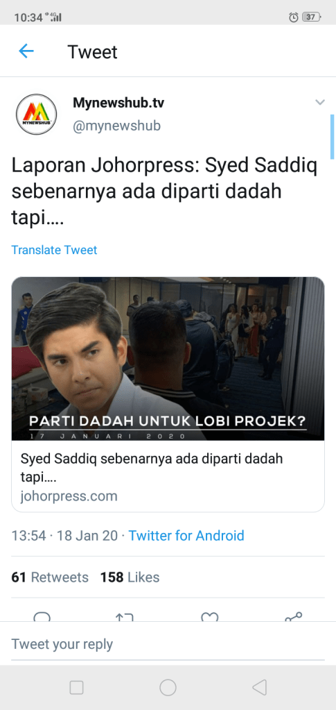 It said: “Syed Saddiq sebenarnya ada di parti dadah tapi ” [“Syed Saddiq was actually at the drug party but…] that went viral on WhatsApp and third-party media Mynewshub.