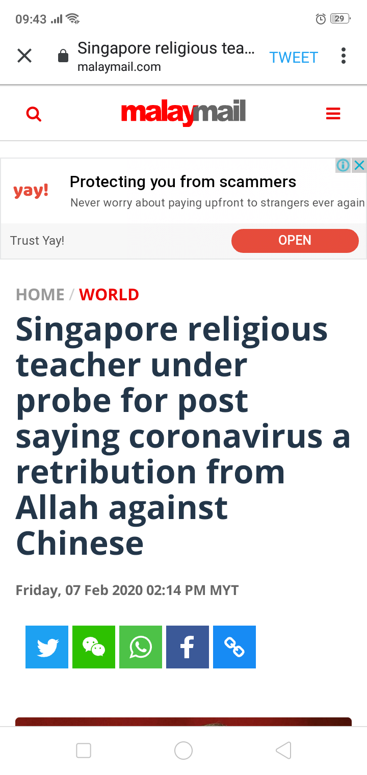 SINGAPORE — The Ministry of Home Affairs (MHA) and the Islamic Religious Council of Singapore (Muis) are investigating a religious teacher who had said on Facebook that the novel coronavirus was retribution by Allah against the Chinese for oppressing Muslim Uighurs.