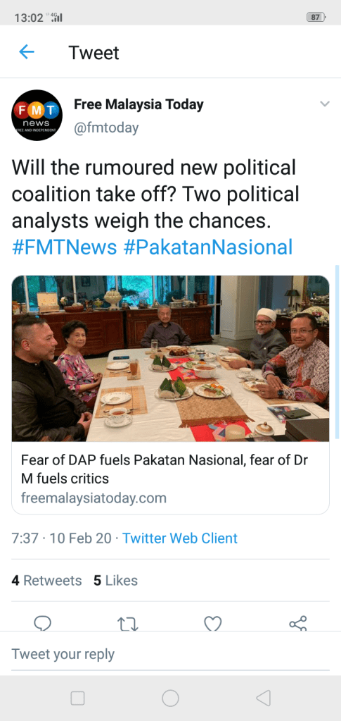 “Yes, the new Pakatan Nasional looks very enticing, especially for the Malays but to form a government you need the support of all. I don’t see this getting off the ground even though Pakatan Nasional is being portrayed as the alternative to Pakatan Harapan,” he told FMT.