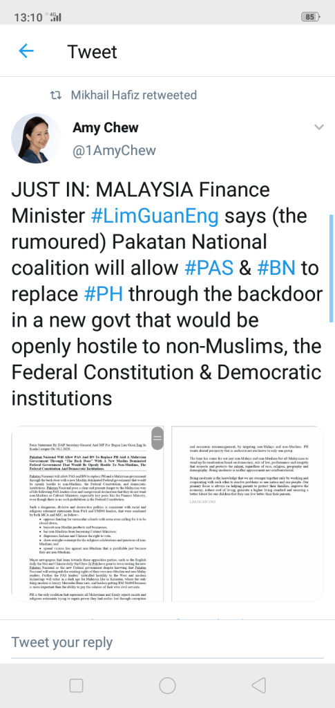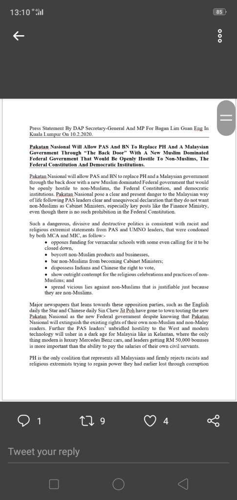 Lim said some major newspapers that lean towards Opposition parties have been harping on Pakatan Nasional and he claimed that the new rumoured coalition will pose a clear and present danger to the Malaysian way of life.