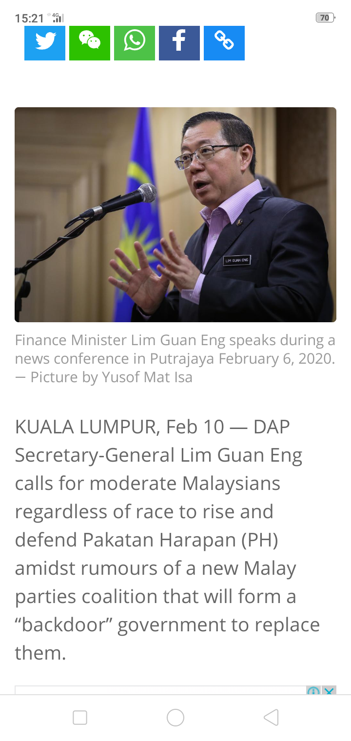 KUALA LUMPUR, Feb 10 — DAP Secretary-General Lim Guan Eng calls for moderate Malaysians regardless of race to rise and defend Pakatan Harapan (PH) amidst rumours of a new Malay parties coalition that will form a “backdoor” government to replace them.