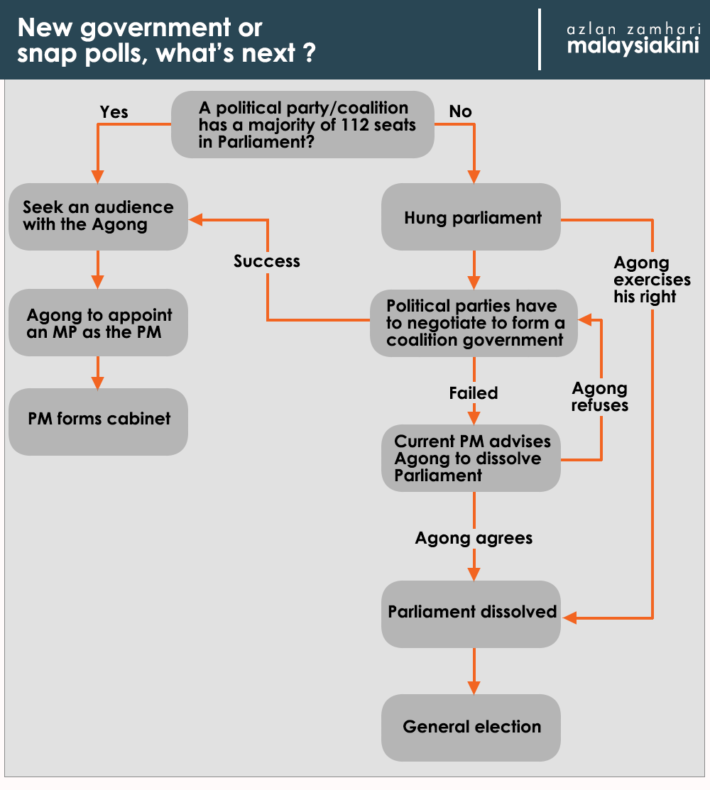 If the parties are unable to negotiate and form a coalition, the prime minister may advise the Agong to dissolve Parliament, paving way for a snap election.