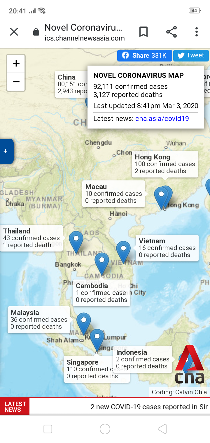 Channel News Asia has set up a “live” count of where Novel Coronavirus has hit…