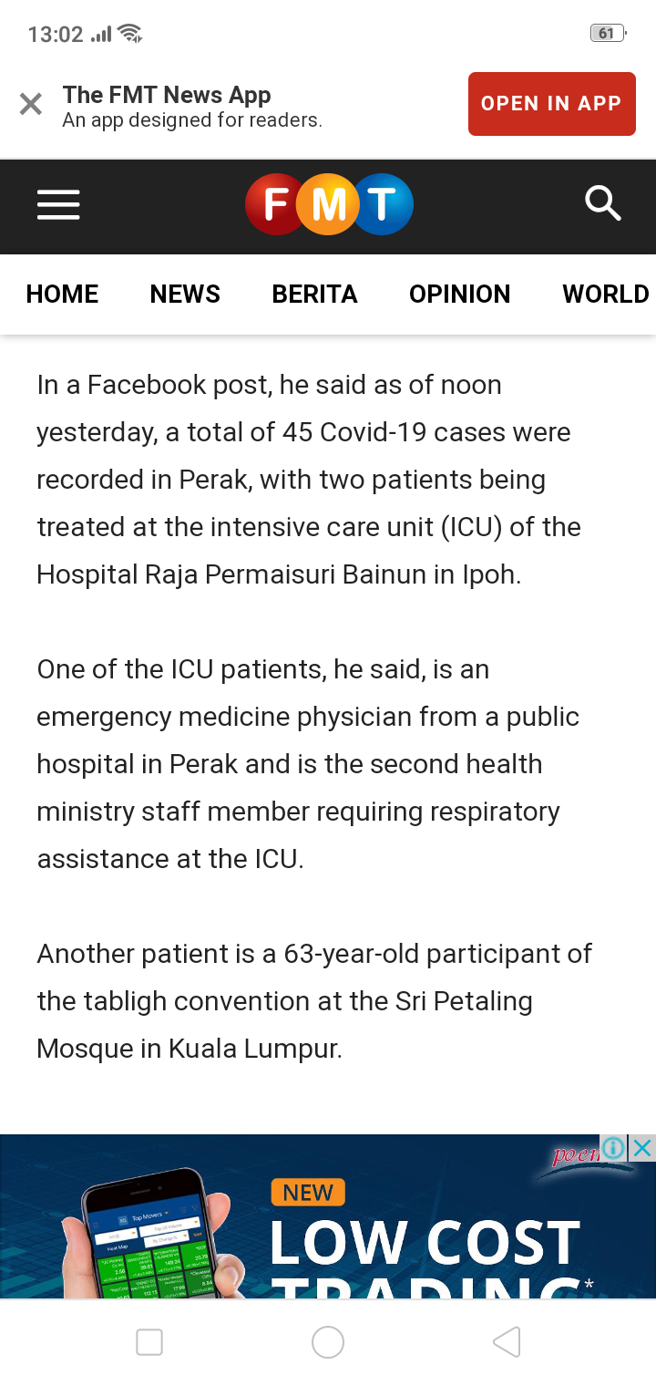 In a Facebook post, he said as of noon yesterday, a total of 45 Covid-19 cases were recorded in Perak, with two patients being treated at the intensive care unit (ICU) of the Hospital Raja Permaisuri Bainun in Ipoh.