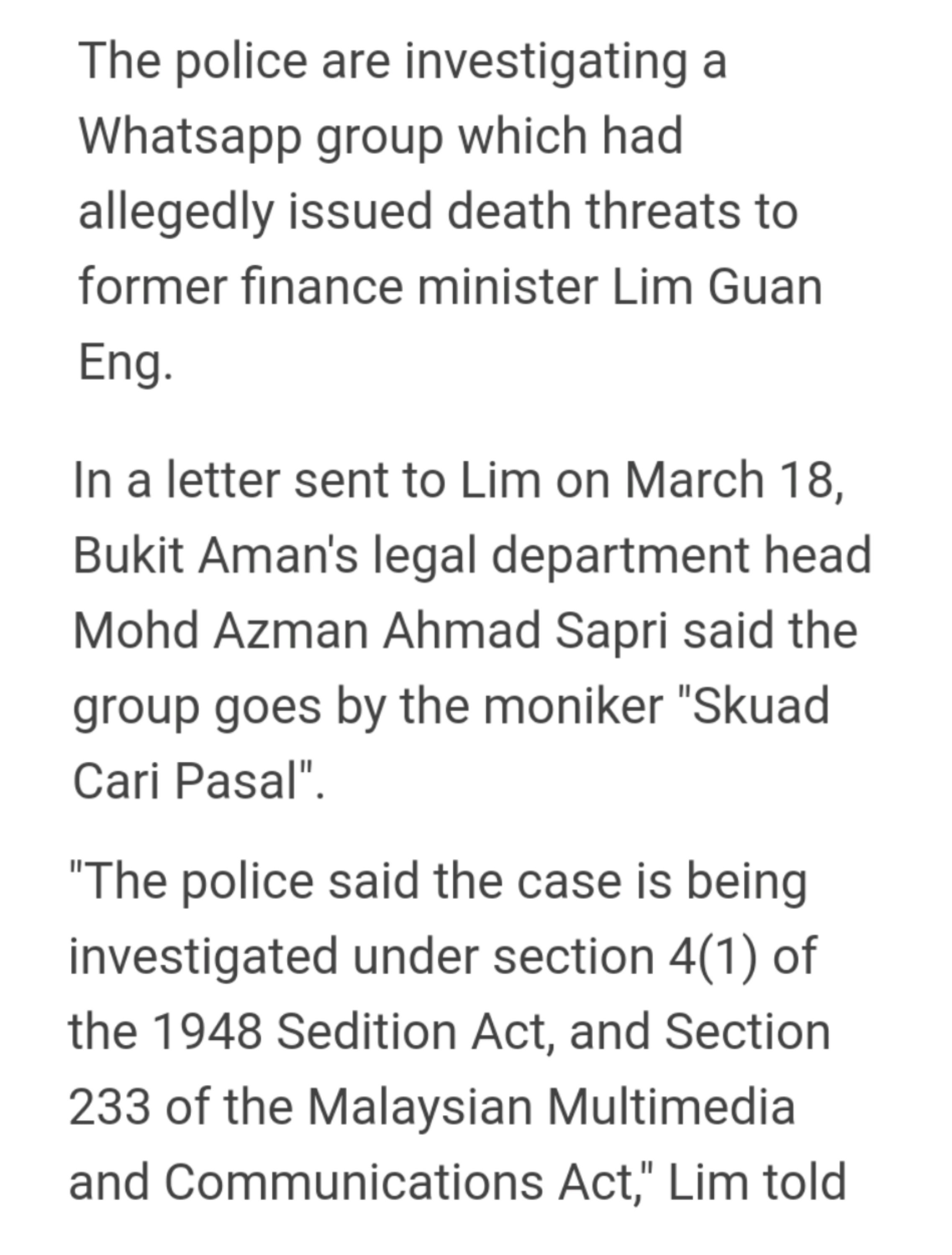 Cops probe Whatsapp group for sending death threats to Guan Eng https://t.co/fC9xFCNzOF pic.twitter.com/LgcXkVNebh