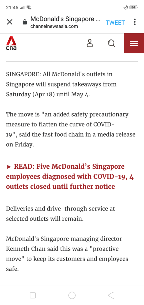 McDonald's Singapore removes takeaway service from April 18 to May 4 #mcdonalds #singapore #circuitbreaker https://t.co/jY0Y2H25mS