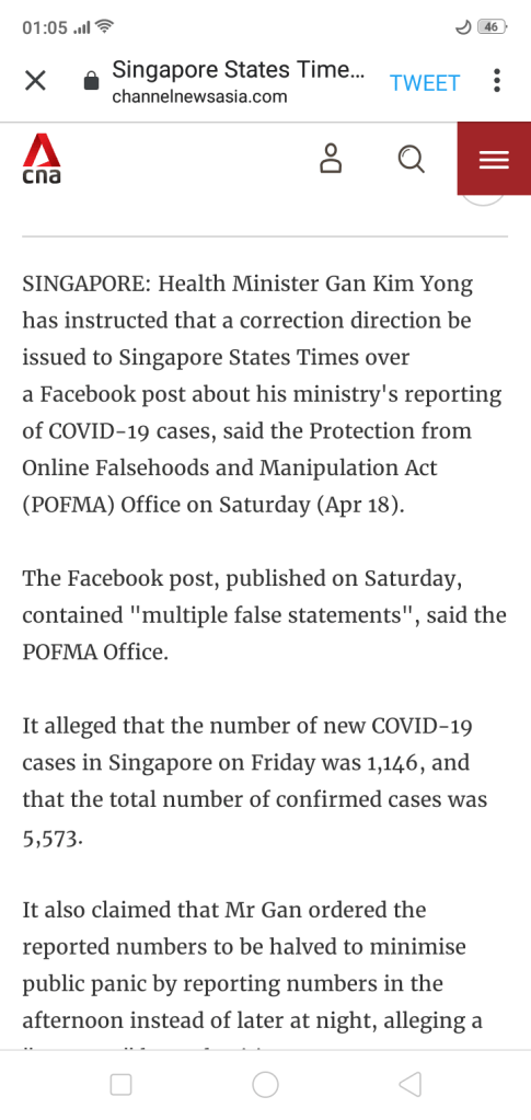 Singapore States Times issued correction direction over Facebook post about MOH's reporting of COVID-19 cases https://t.co/xujKrDuQjc pic.twitter.com/hImcVULCJA