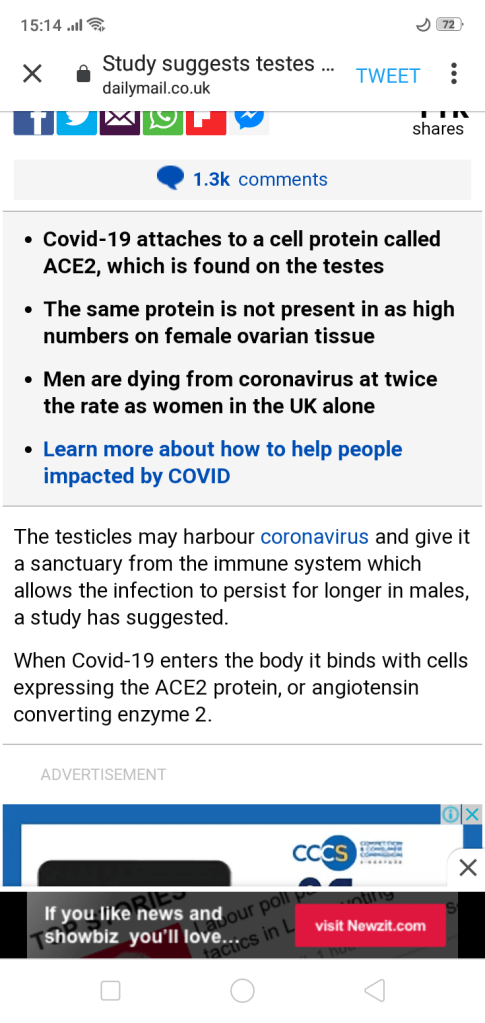 Women have ovaries but men have testes, and testes are the ‘special reservoir’ of Covid-19!