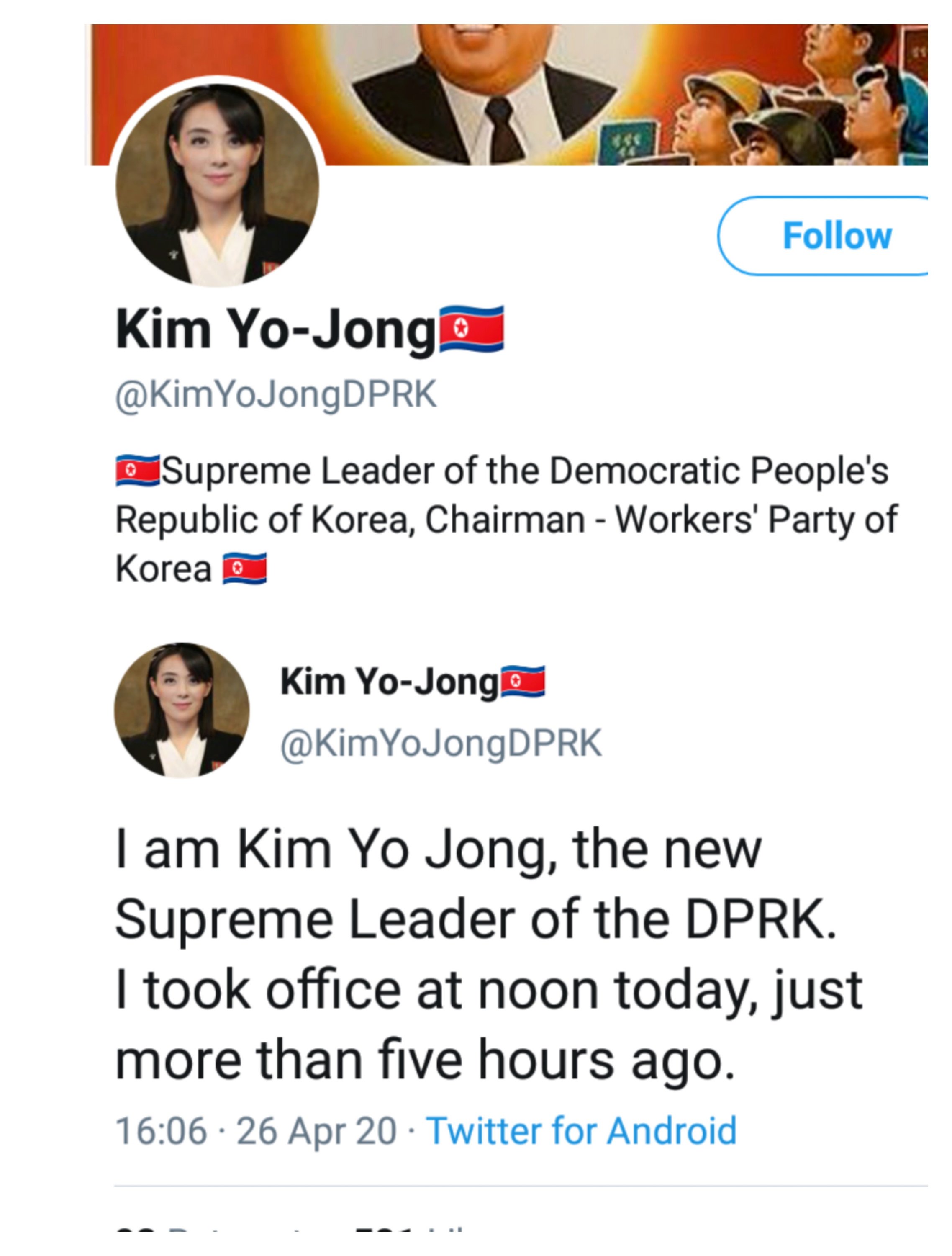 https://twitter.com/KimYoJongDPRK/status/1254084014757076993?s=19