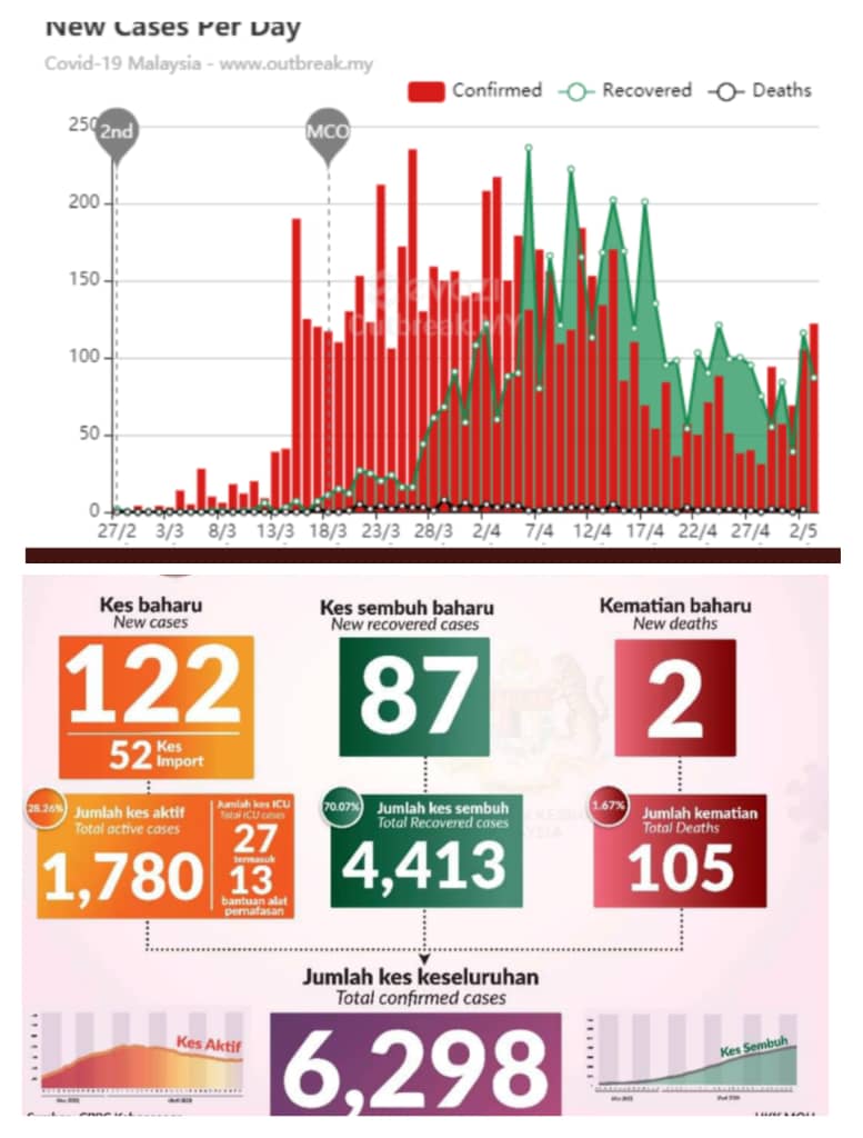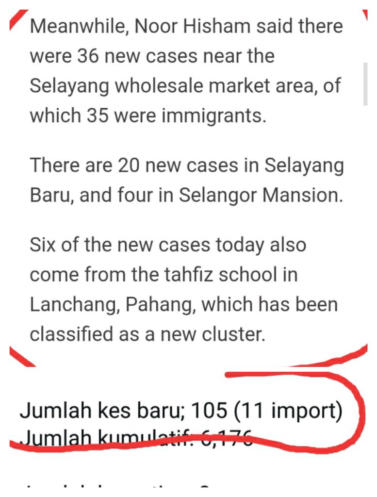 Figures given on 2 May: 105 new cases. Selayang wholesale market 36. Selayang Baru 20. Selangor Mansion 4. Tahfiz school in Pahang 6.