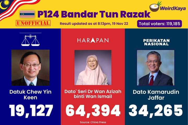 PH’s Datuk Seri Wan Azizah Wan Ismail wins in BANDAR TUN RAZAK, defeating PN incumbent Datuk Kamarudin Jaafar and BN’s Chew Yin Keen. pic.twitter.com/Vm0ev9X0Cp